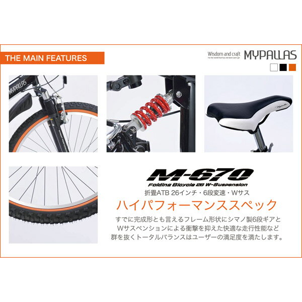 快適なシティユースを目指した設計で使い勝手バツグン!Wサスペンション搭載で心地よいクッション性と折畳機能付きで車に積めるオールラウンダーバイシクル□折畳ATB26インチ・6段ギア・Wサス M-670□本体サイズ(mm):約H950~975×W570×L1740□本体重量:約18.0kg□折畳サイズ:約H770×W330×L990□梱包重量:約21.0kg□サドル高さ:830〜910mm□フレーム:スチール リム:アルミ 前輪ブレーキ:Vブレーキ 後輪ブレーキ:Vブレーキ□備考 シマノ製変速ギア・フラットタイプハンドルバー・折畳二重ロック・ツートンサドル・前後サスペンション・前後マッドガード・ブラックリム・ディレイラーガード 他□JIS耐振動試験合格品・PL法保険加入済□適応身長:160cm〜□適応体重:75kg以下【注意事項】・自転車は100%完成車ではございません。