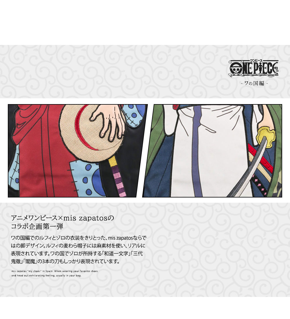 アニメワンピース × mis zapatos コラボ企画第一弾 『ONE PIECE 〜ワの国編〜』 ワの国編でのルフィとゾロの衣装をきりとった、mis zapatosならではの脚デザイン。
