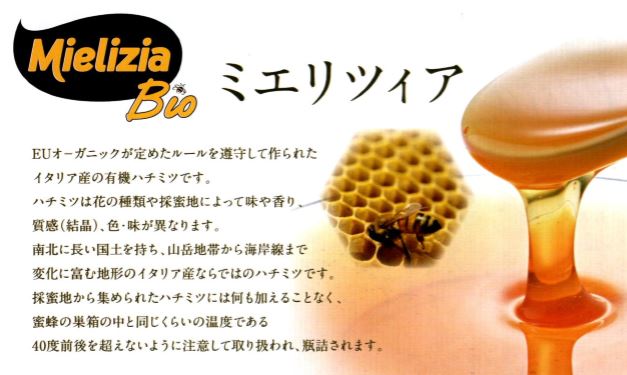 <EUオーガニック規定認証品> 100%純粋はちみつ!! 上品な甘さでクセがない!! ≪ミエリツィア アカシアの有機ハチミツ の特徴≫ ■イタリア北部・中部で採蜜されたアカシアはちみつ■なめらかな質感で、やさしく上品な味わい。