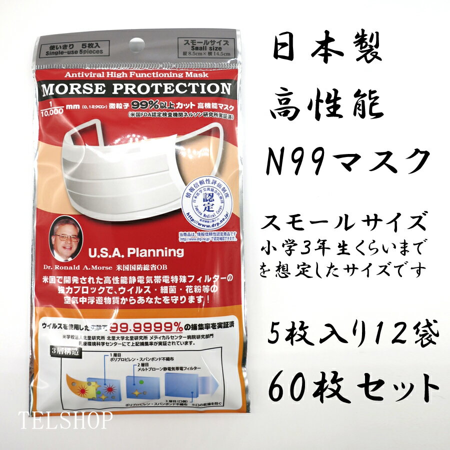 モースプロテクション モースマスク 5枚入り×12袋 計60枚 持ち運びに便利な小袋タイプ スモールサイズ 子供用小学三年生程度迄を想定 N99高機能フィルター使用マスク 日本製マスク